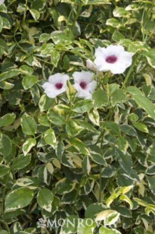 perez nursery twining branches hold glossy bright green leaves with cream edging creating a perfect background for the flowers. Soft pink trumpet-shaped blooms have rosy purple throats for a lovely effect. Grow on a trellis to cover walls or fences.